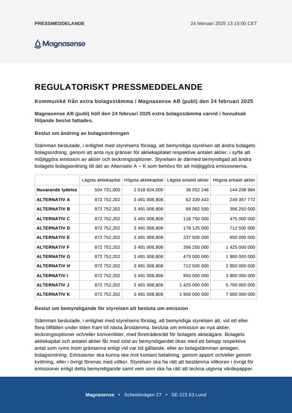 Kommuniké från extra bolagsstämma i Magnasense AB (publ) den 24 februari 2025
