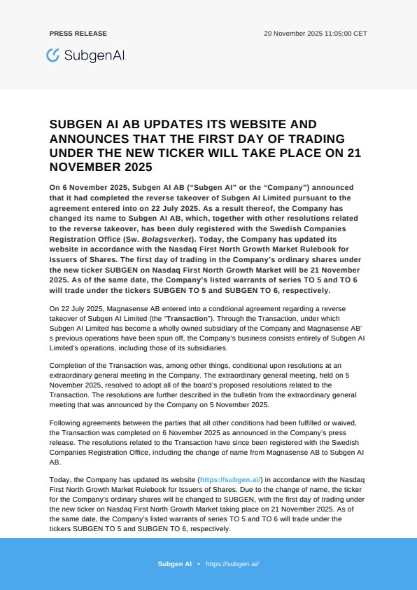 On 6 November 2025, Subgen AI AB (“Subgen AI” or the “Company”) announced that it had completed the reverse takeover of Subgen AI Limited pursuant to the agreement entered into on 22 July 2025. As a result thereof, the Company has changed its name to Subgen AI AB, which, together with other resolutions related to the reverse takeover, has been duly registered with the Swedish Companies Registration Office (Sw. Bolagsverket). Today, the Company has updated its website in accordance with the Nasdaq First North Growth Market Rulebook for Issuers of Shares. The first day of trading in the Company’s ordinary shares under the new ticker SUBGEN on Nasdaq First North Growth Market will be 21 November 2025. As of the same date, the Company’s listed warrants of series TO 5 and TO 6 will trade under the tickers SUBGEN TO 5 and SUBGEN TO 6, respectively.